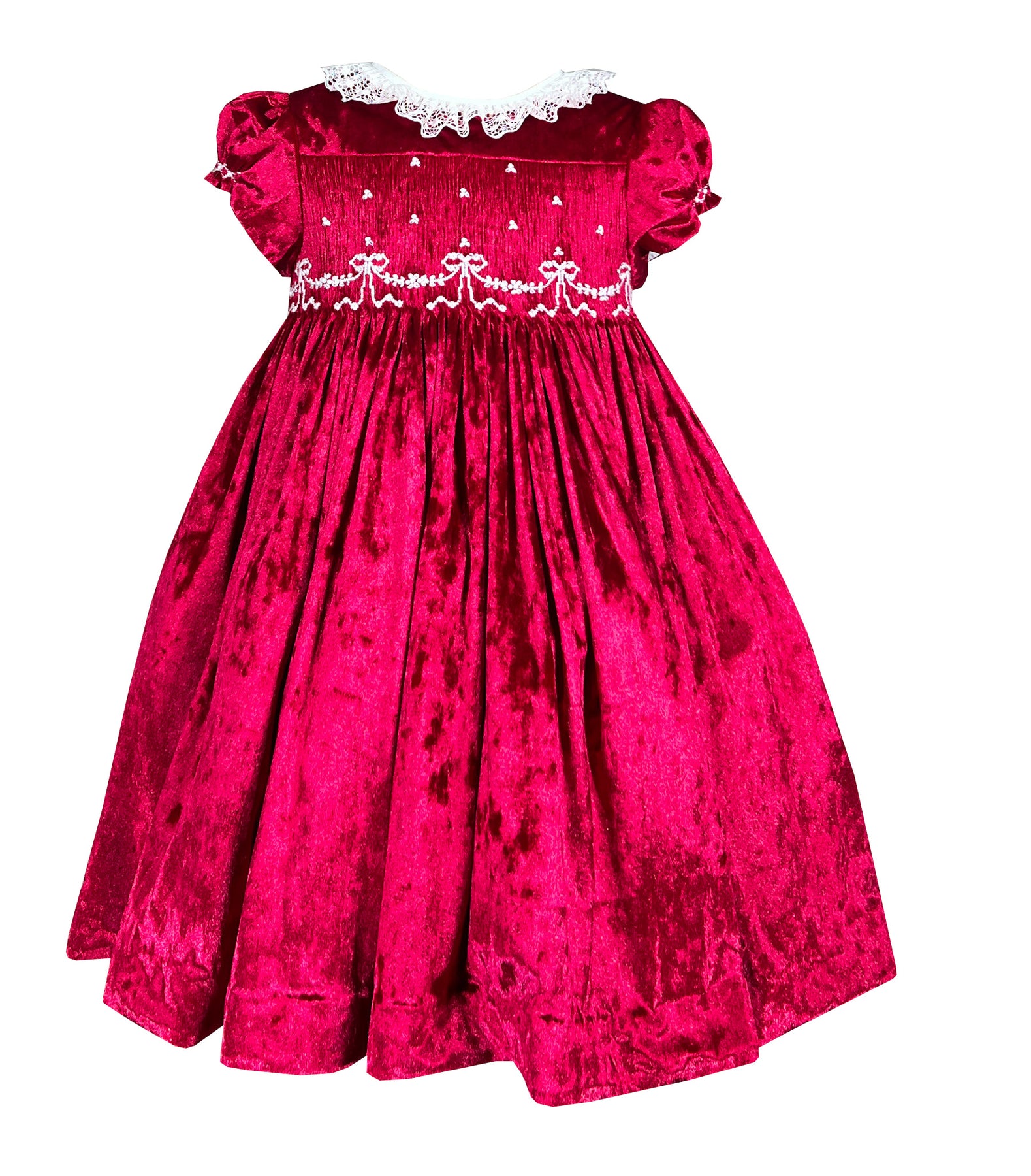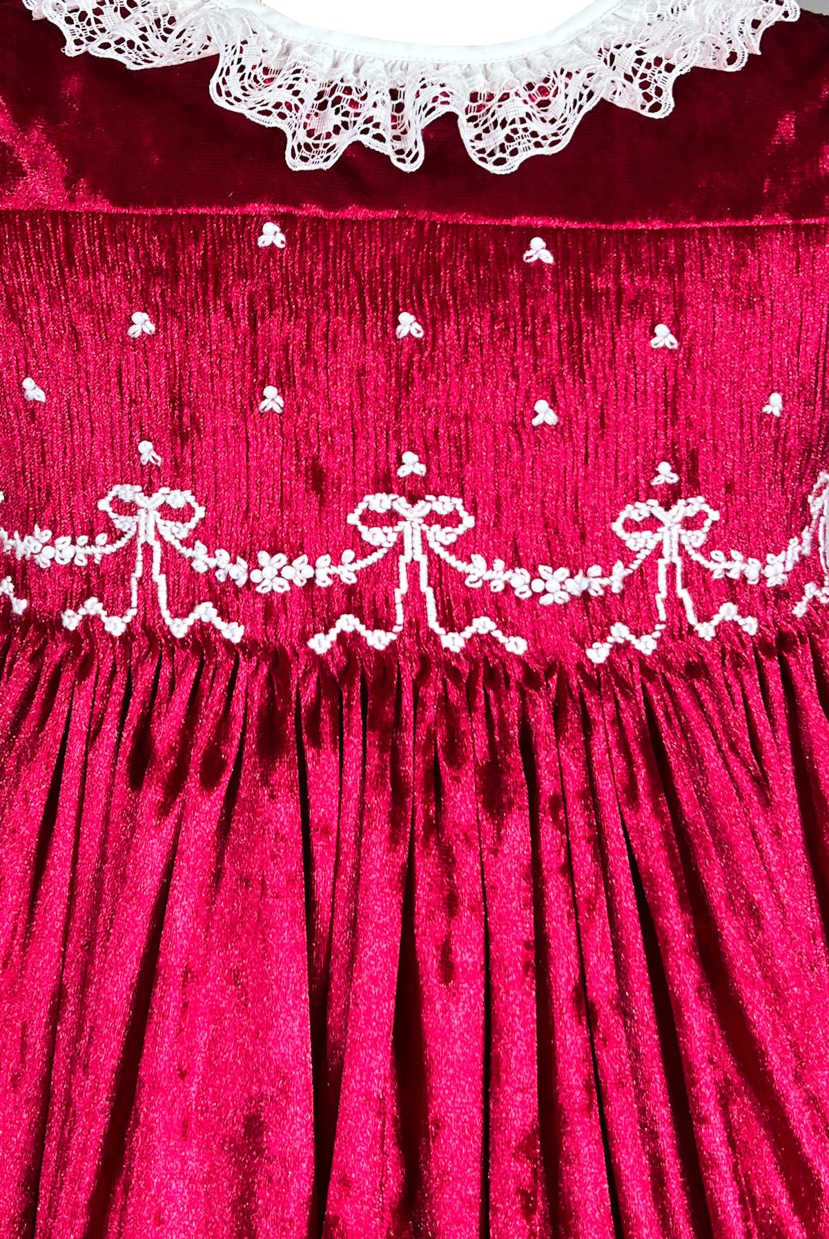 Red velvet Christmas smocked dress with hand-embroidered collar, white lace, hair bow