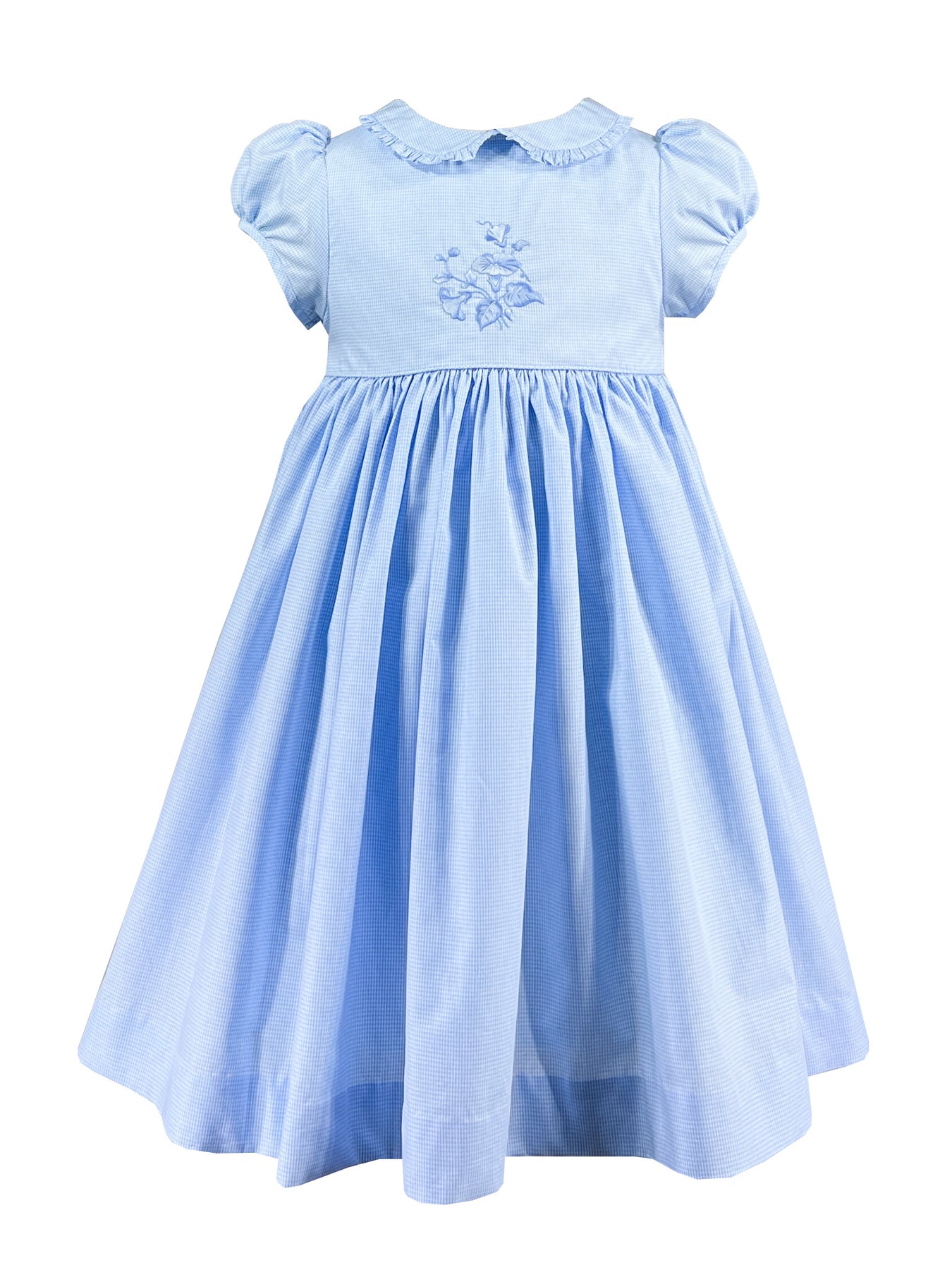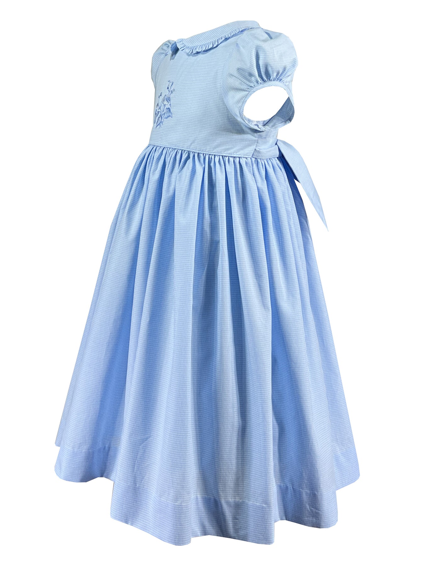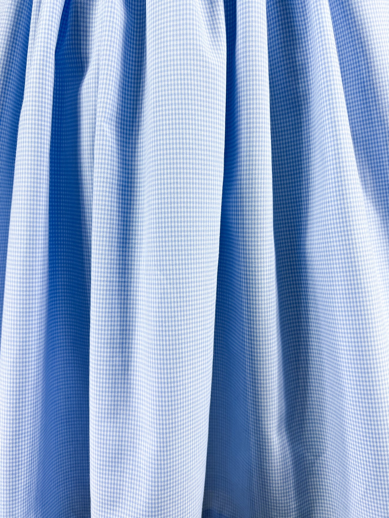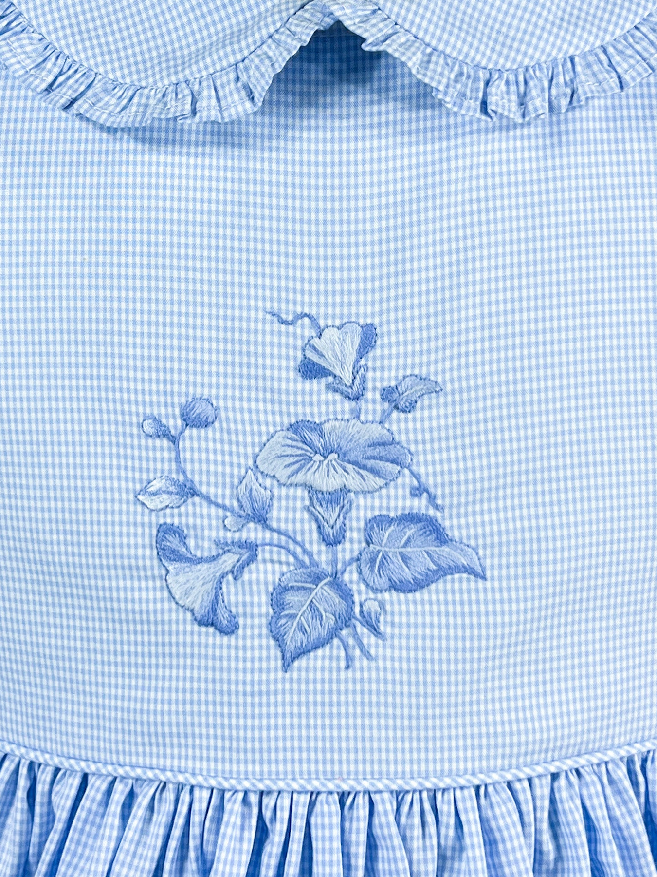 A celebration of morning's first light, the Dawn Blooms dress is crafted in mini checked blue and white satin cotton which recalls the freshness of early hours. At the chest center, a hand embroidered morning glory flower blooms in tone on tone stitching, a delicate tribute to nature's most ephemeral beauty. The threadwork captures the trumpet shaped petals with their characteristic ridges, the unfurling buds, and graceful stems, creating a subtle dimensional artwork that reveals itself upon closer inspection.