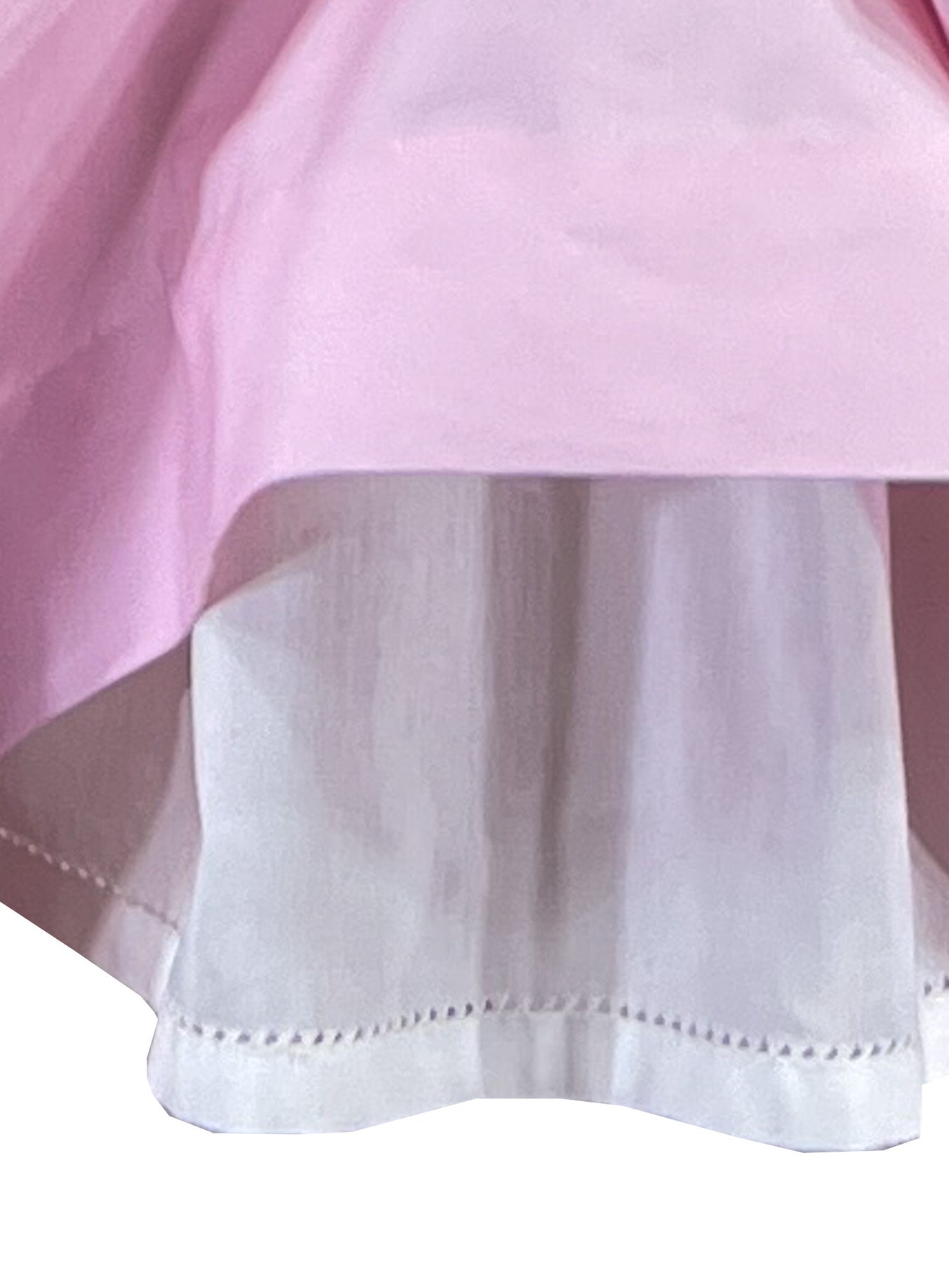 Below the skirt blooms in vibrant rose pink, fully gathered for graceful movement. Self-covered buttons complete the refined finish. Every element demonstrates exceptional craftsmanship and attention to detail.