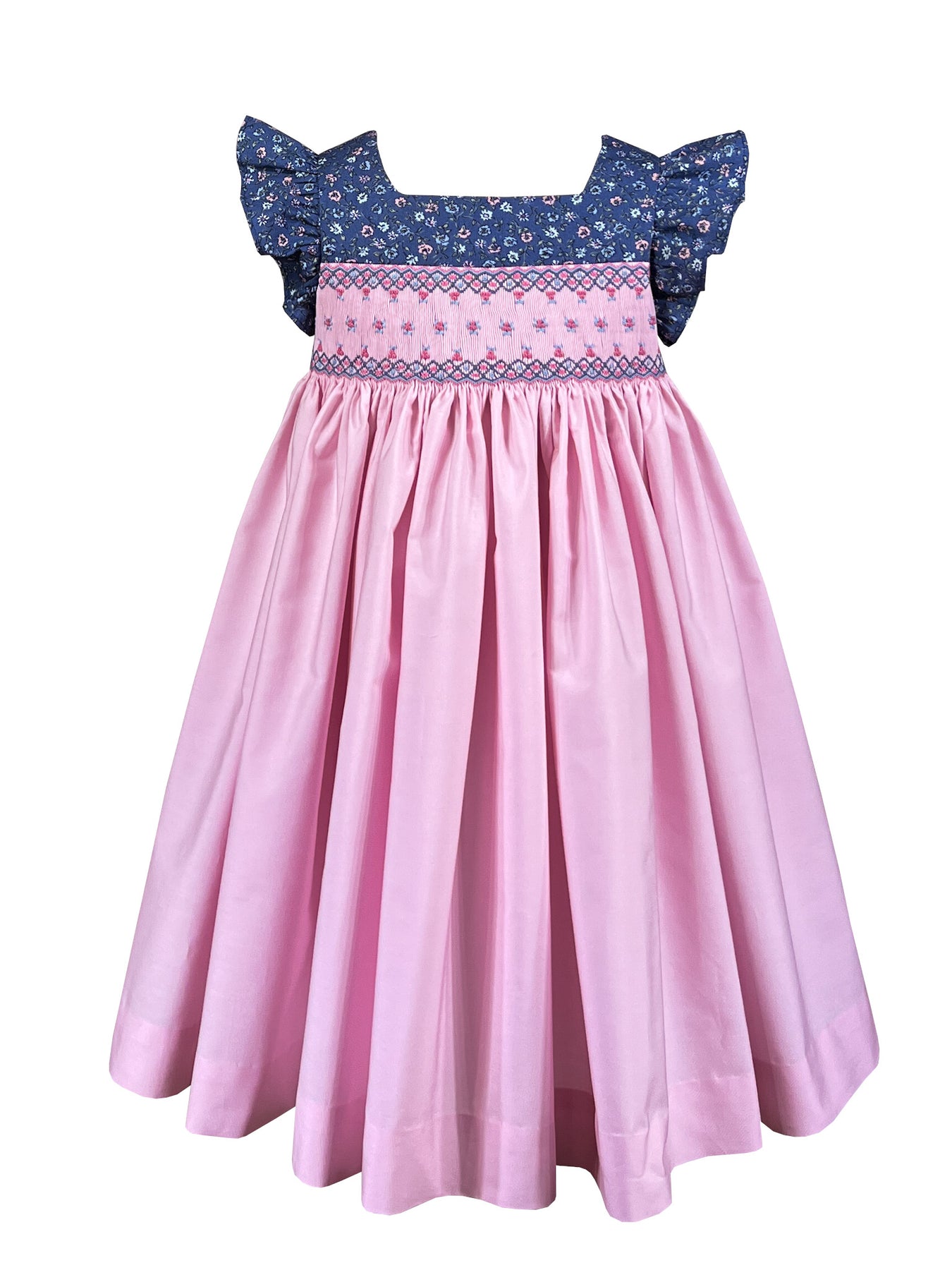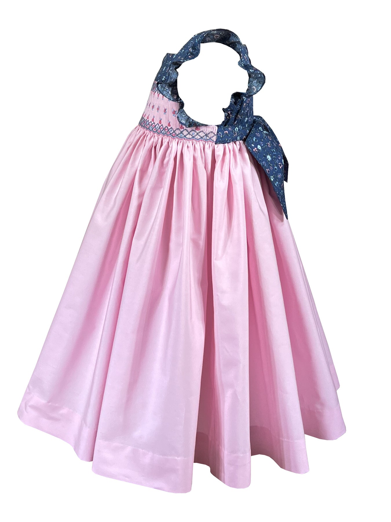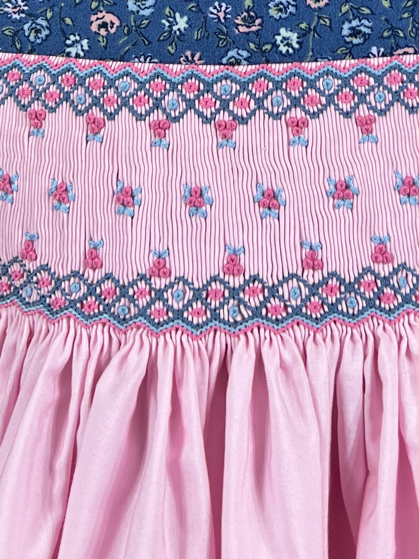 The centerpiece is the smocked pink bodice showcasing intricate geometric patterns worked in shades of blue and pink threads. The smocking creates dimensional borders above and below, framing a center section where tiny hand-embroidered flower bouquets appear at regular intervals like evening stars. Each embroidered cluster features three blooms tied with delicate blue leaves.