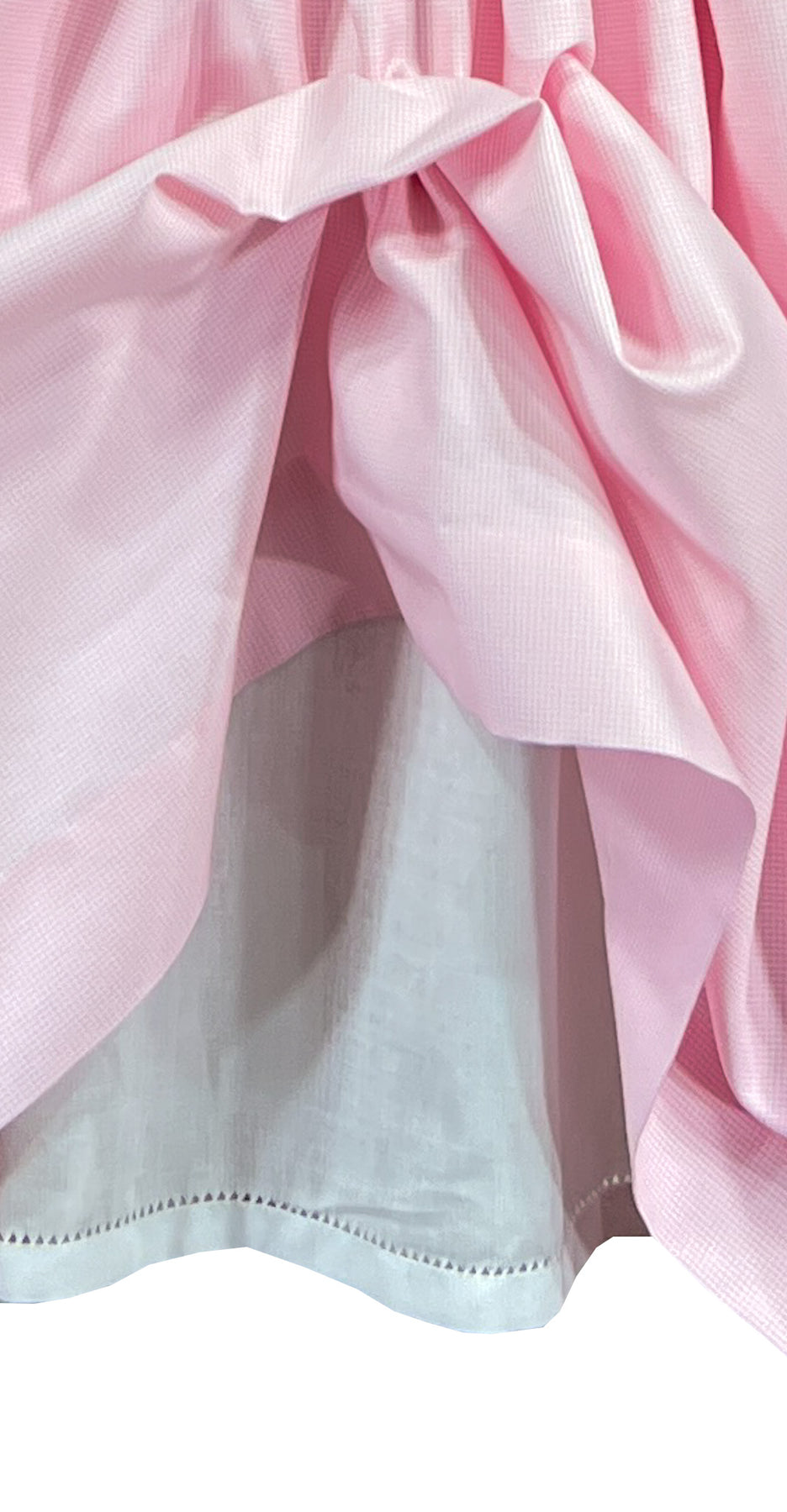 The full gathered skirt flows gracefully from the hand-smocked bodice, creating lovely movement with every step. Self-covered buttons fasten down the back, and a bow sash  at the waist ensures a perfect fit.