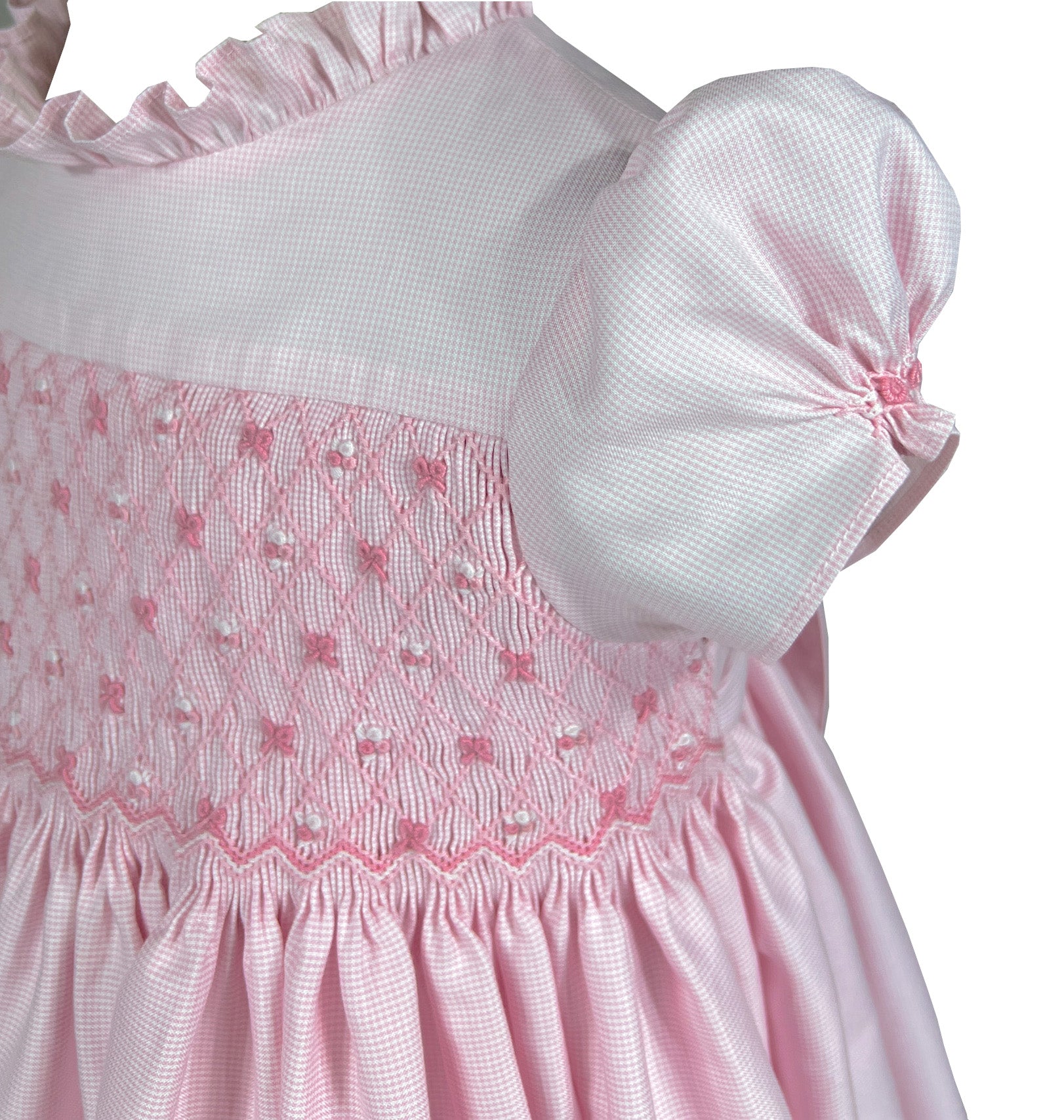 The bodice showcases exquisite hand smocking adorned with miniature embroidered bows and rosebud in coordinating tones, each one meticulously stitched to create a garden of ribbons across the chest. These add dimensional texture and whimsical charm to the classic smocked silhouette.