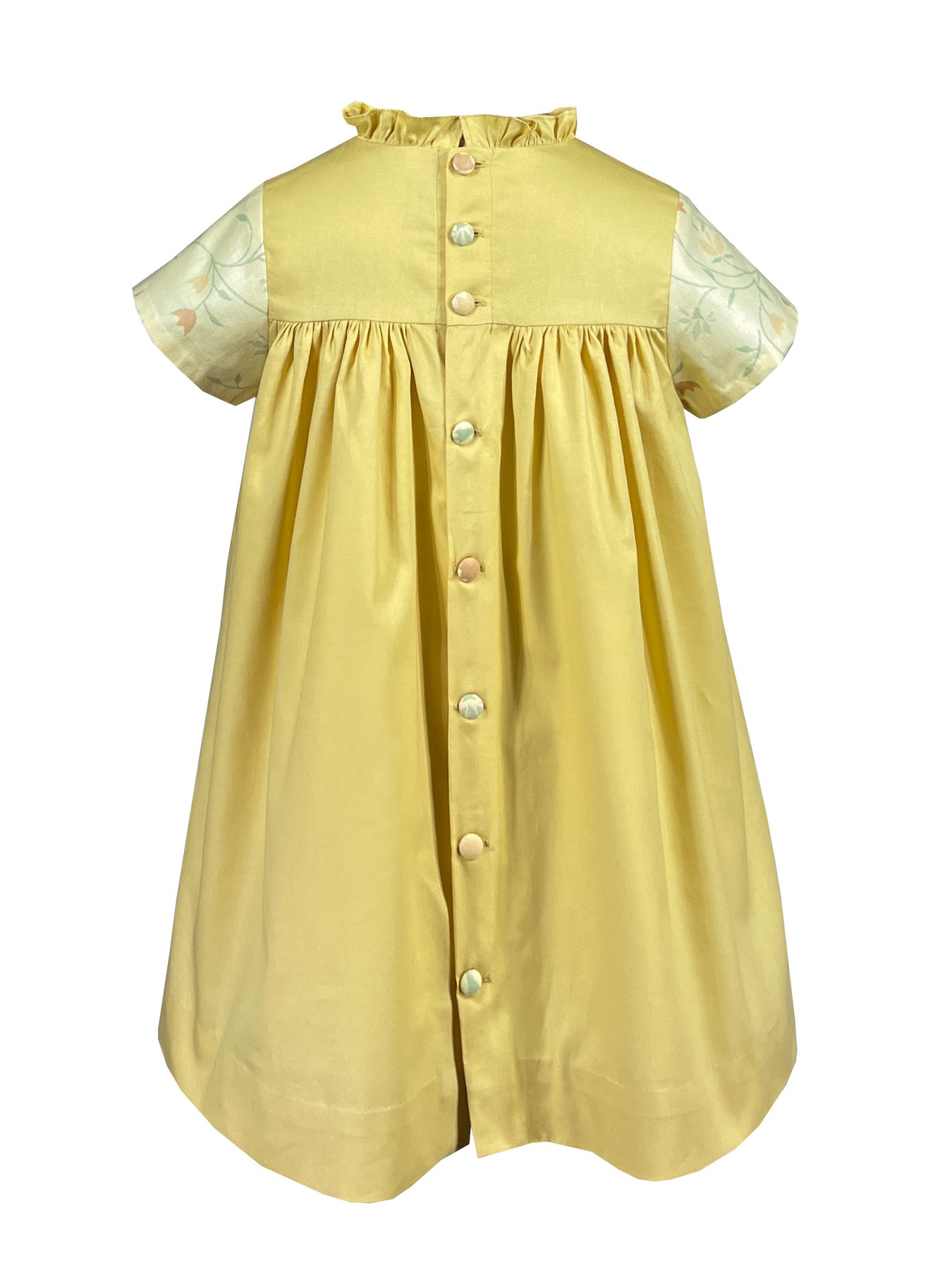At the empire waist, exquisite hand-smocking creates a beautiful bridge between the floral bodice and sunny yellow skirt. Self-covered buttons complete the look.