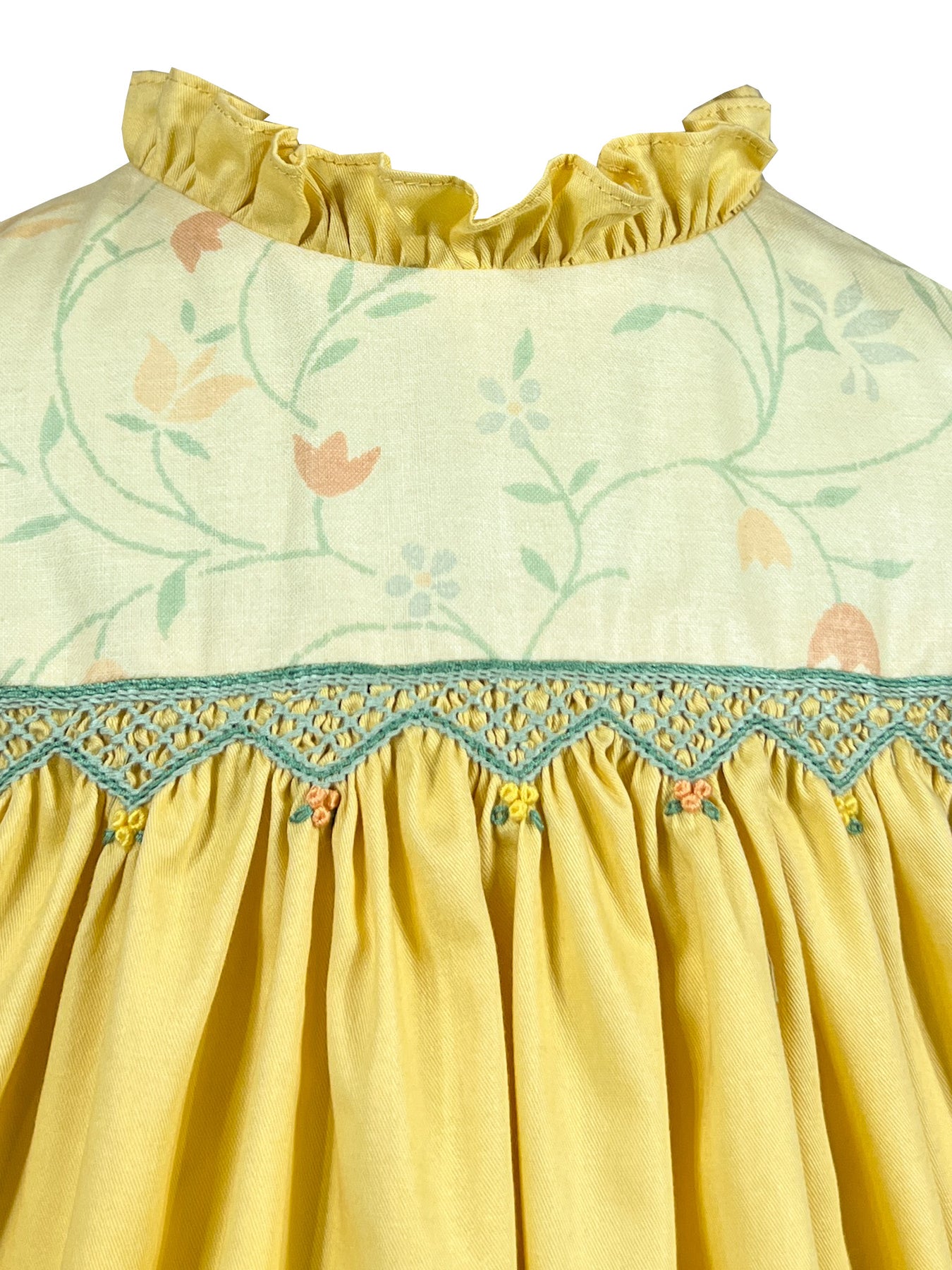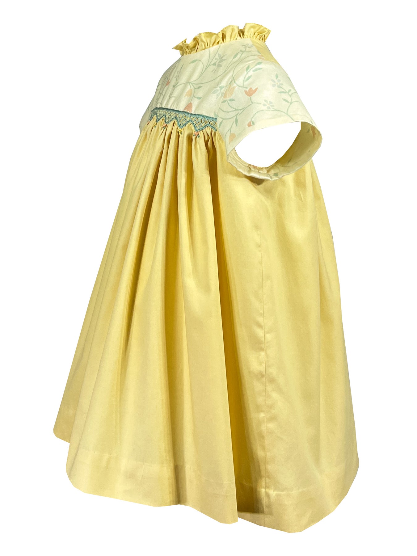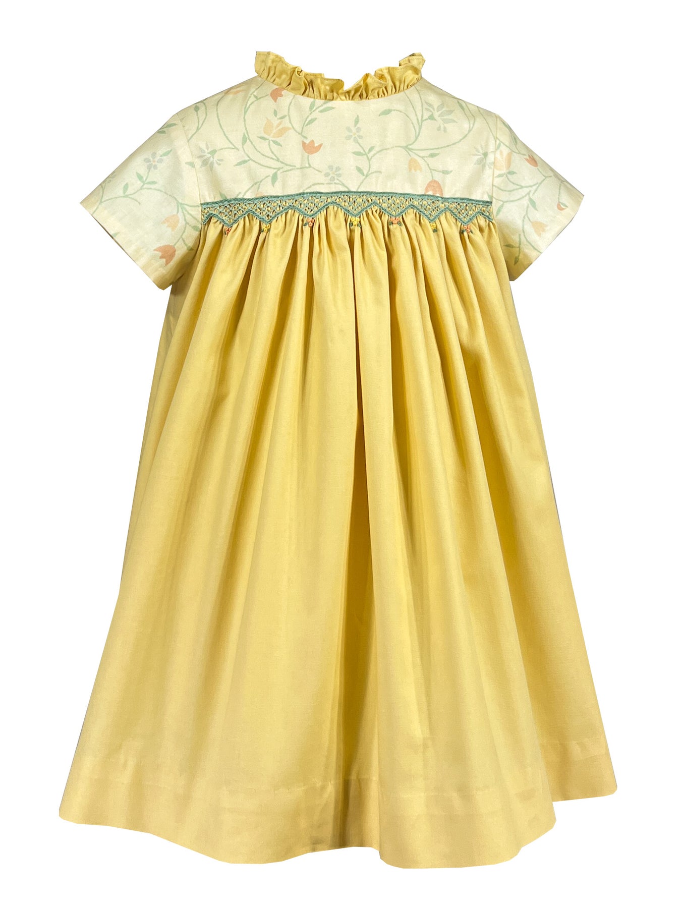 Traditional smocked dress | floral vine pattern | soft yellow fabric