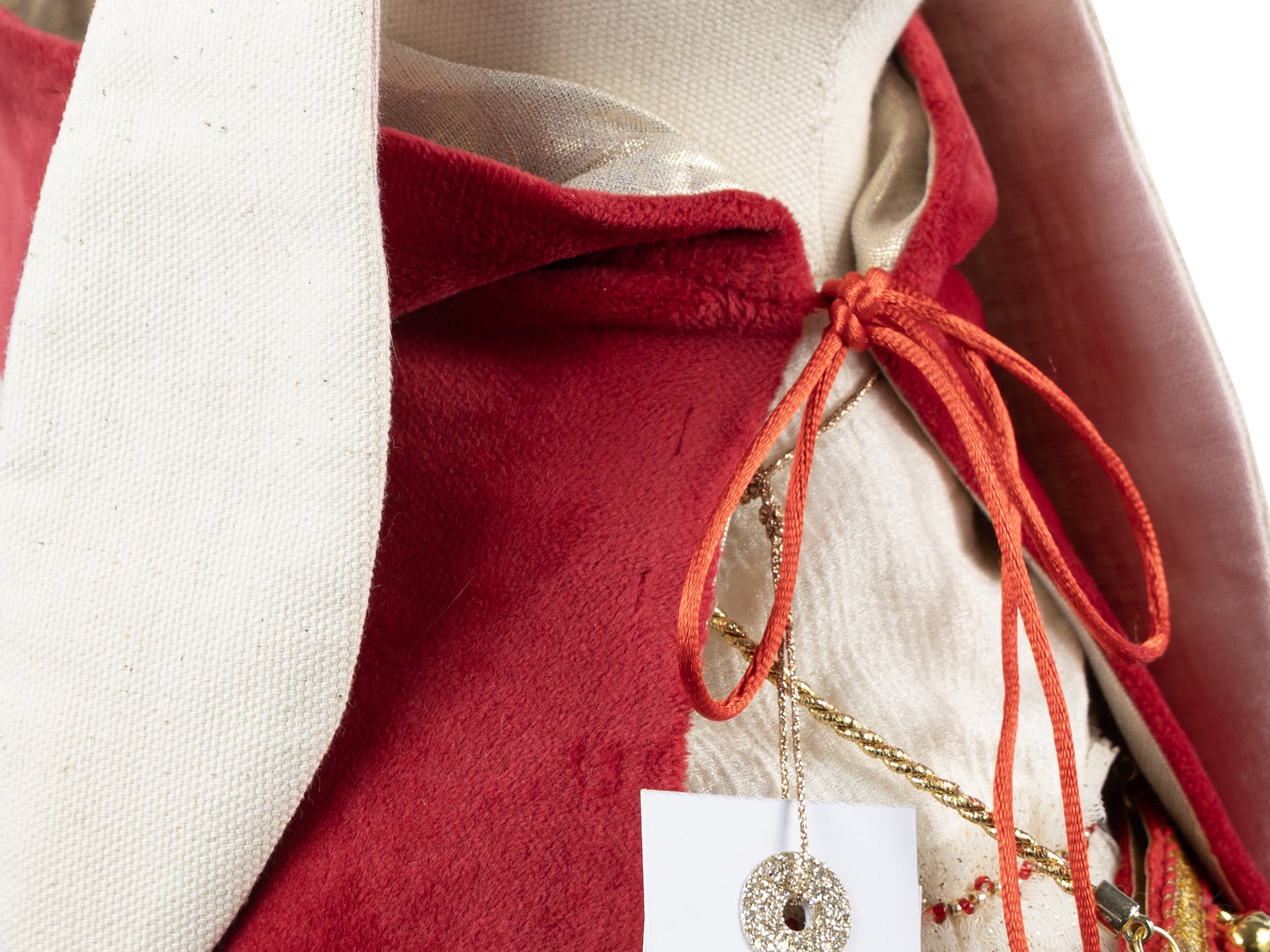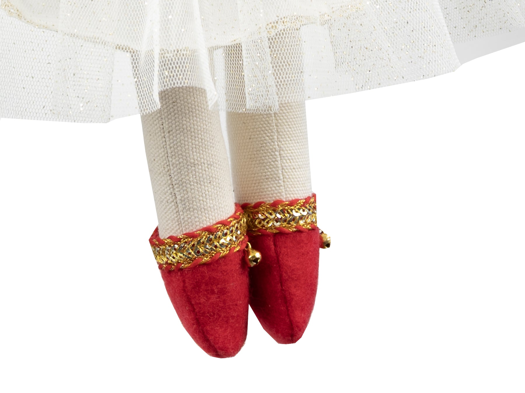 All elements of clothing can be removed. The cape is made of red velvet. The dress features layers of sparkly white tulle. The floral crown is handcrafted with fabric flowers.