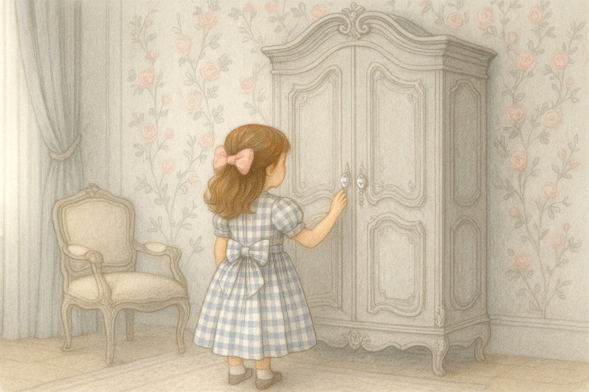 Open the doors of our enchanted wardrobe and step into a world as soft as dove's grey feathers and gentle as morning mist, where peaceful grey skies shelter the most delicate climbing roses. Here, little girls discover that quiet beauty can bloom everywhere : even pink flowers find their way up dove-grey walls, creating magic in the softest of places.