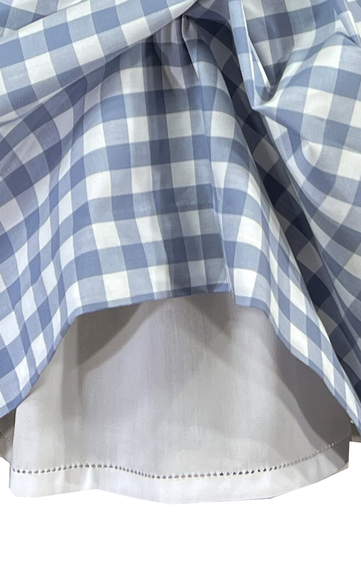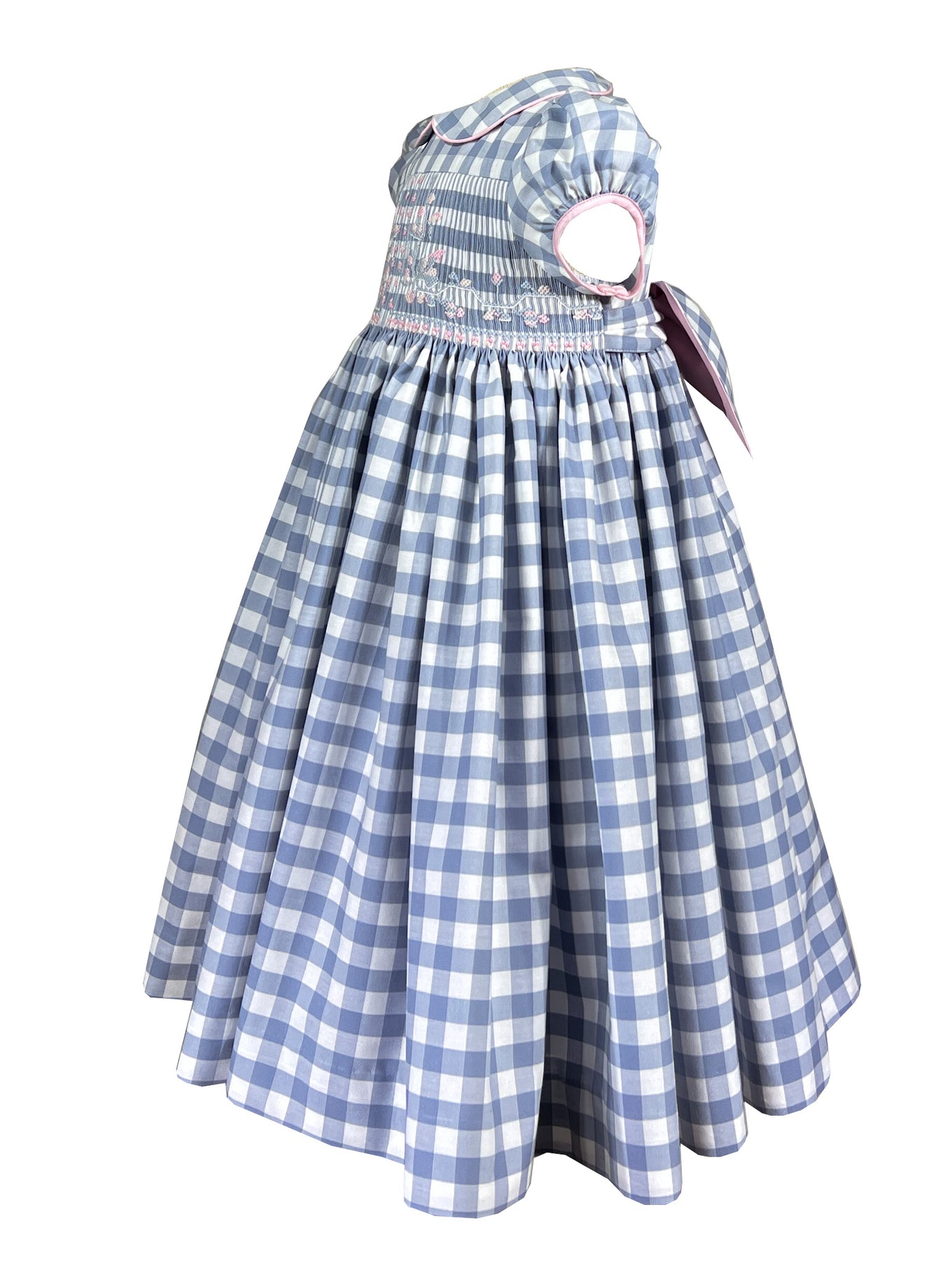 A subtle French style beauty, the Dove's Secret Garden dress combines soft grey and white gingham with the most refined embroidered details.