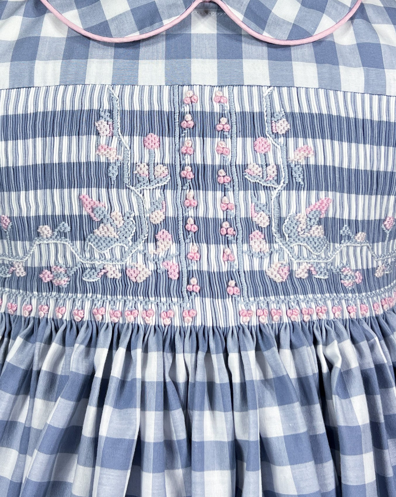 The bodice features exquisite hand smocking adorned with delicate pink climbing roses and tiny flowers, each one meticulously stitched to create a secret garden blooming across the chest. The classic gingham check provides timeless charm while the floral embroidery adds romantic whimsy.