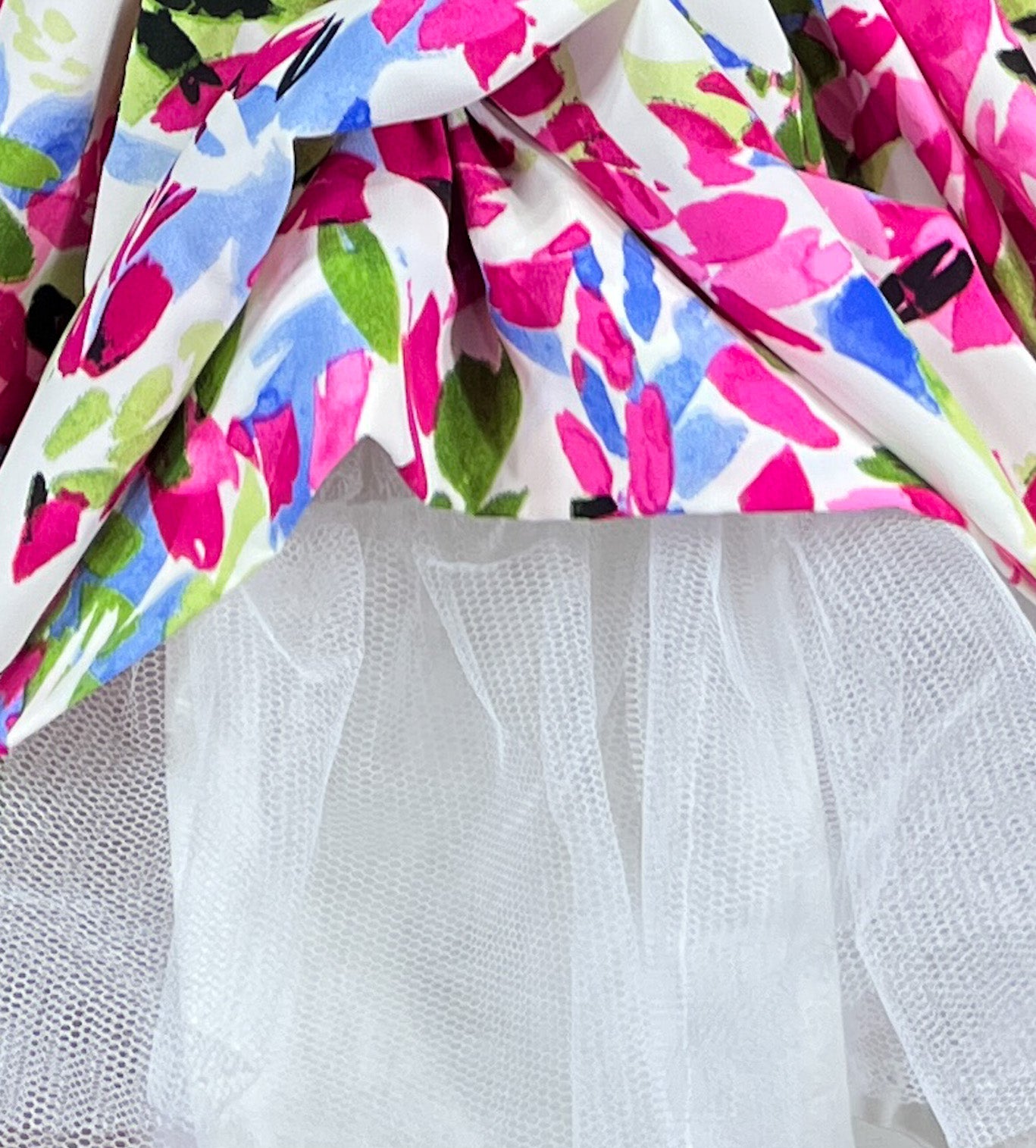 A rainbow of joy in the most vibrant floral print, the Happiness Blooms Netti dress celebrates life in full color. Bold flowers in shades of hot pink, fuchsia, green, and blue dance across pristine white fabric, creating an exuberant garden that captures childhood's boundless energy.
