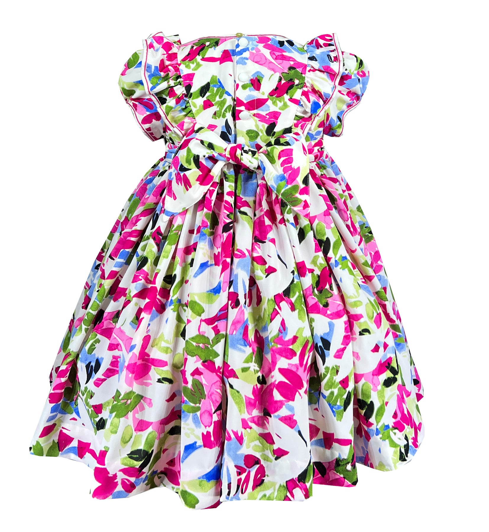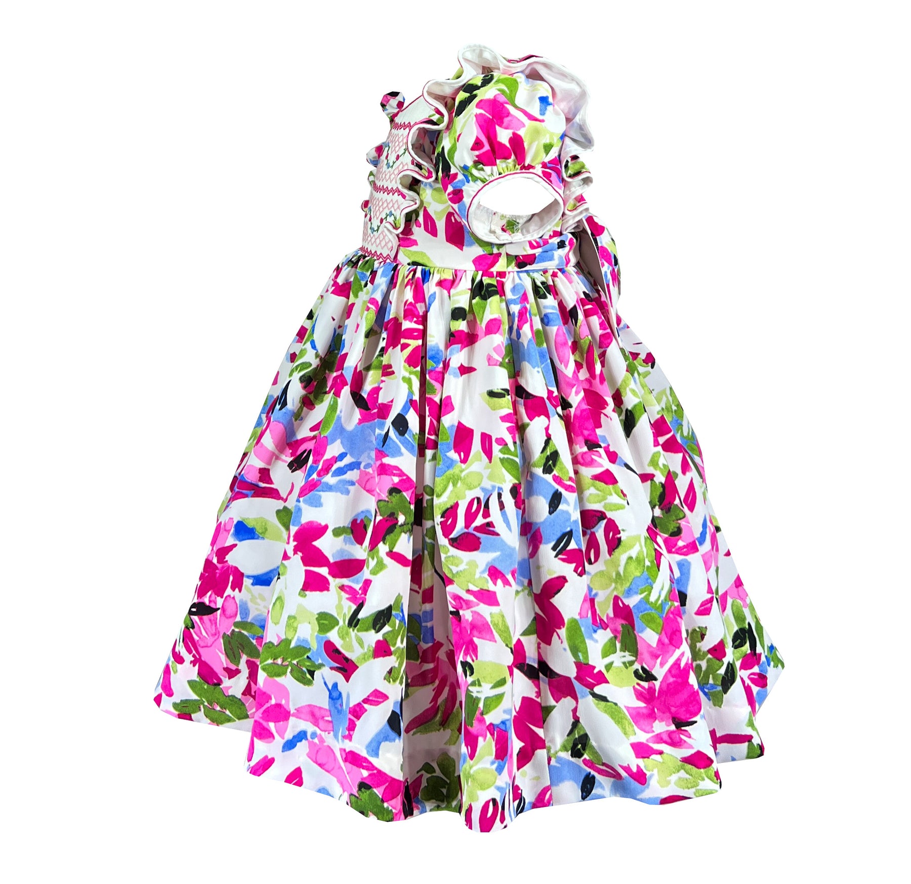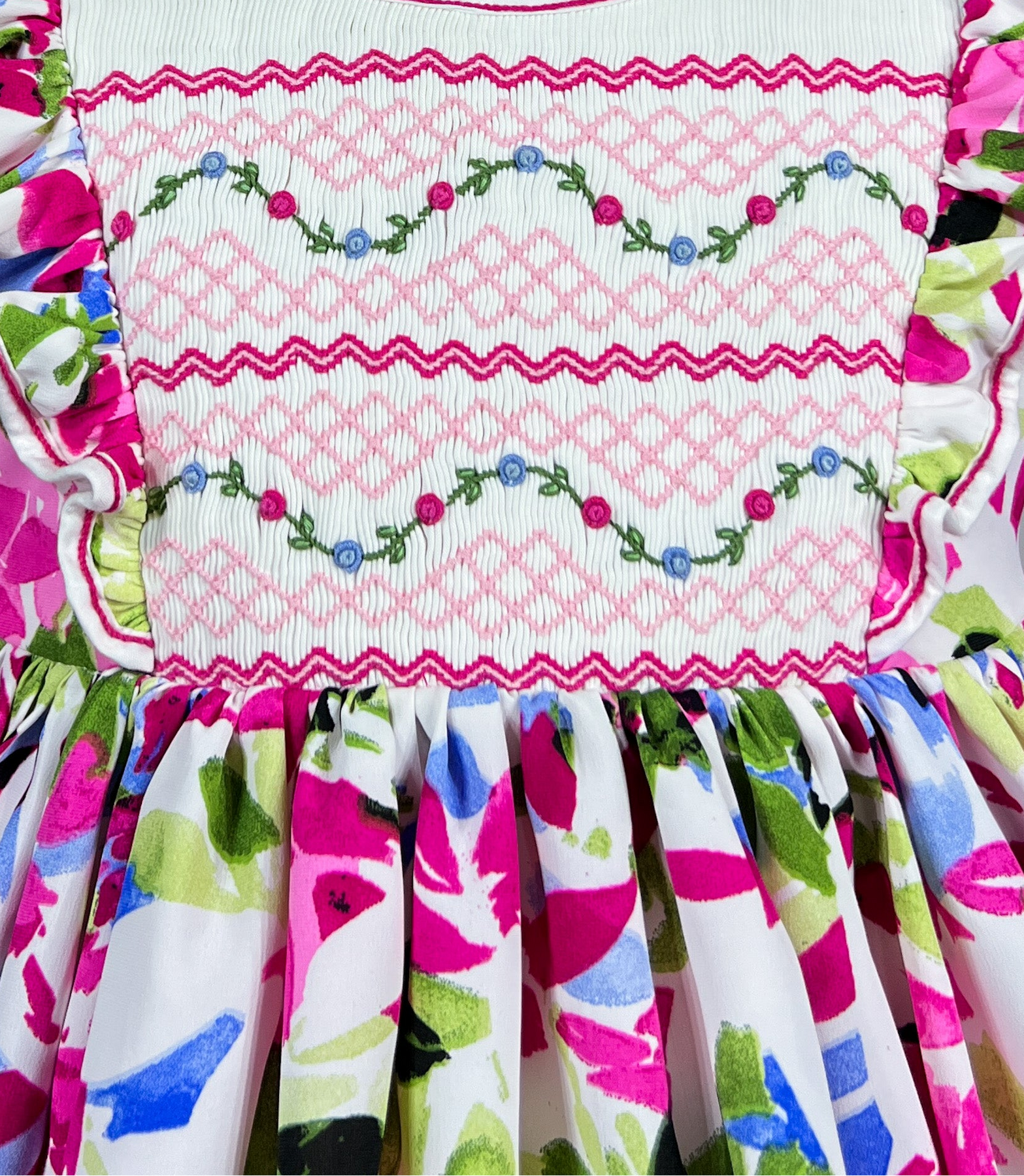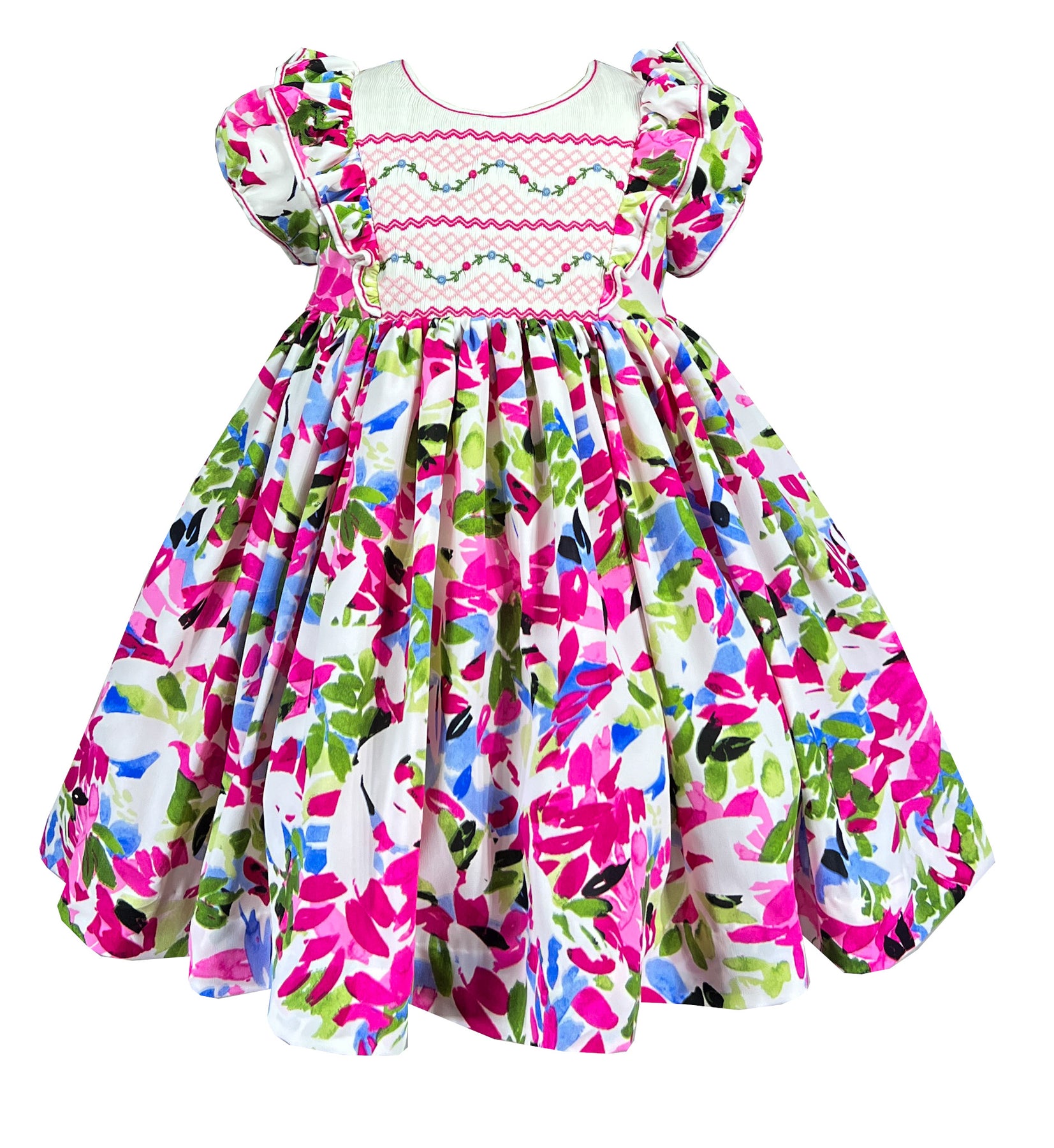 The white pleated bodice features intricate hand smocking with geometric pink, blue and green patterns that complement the vibrant floral print. It is framed by delicate ruffles cascading down the shoulders and chest flutter like butterfly wings and classic puffed sleeves. Just like the round neckline, all are trimmed with a fuchsia thread.