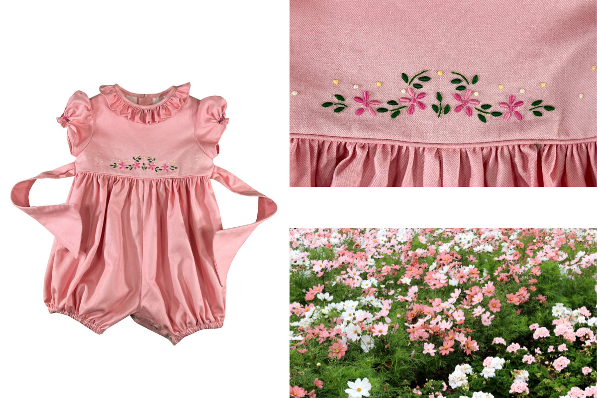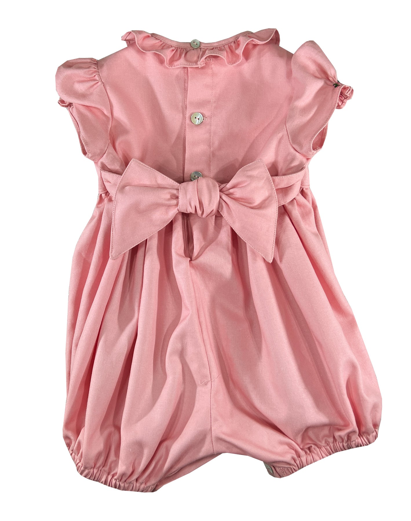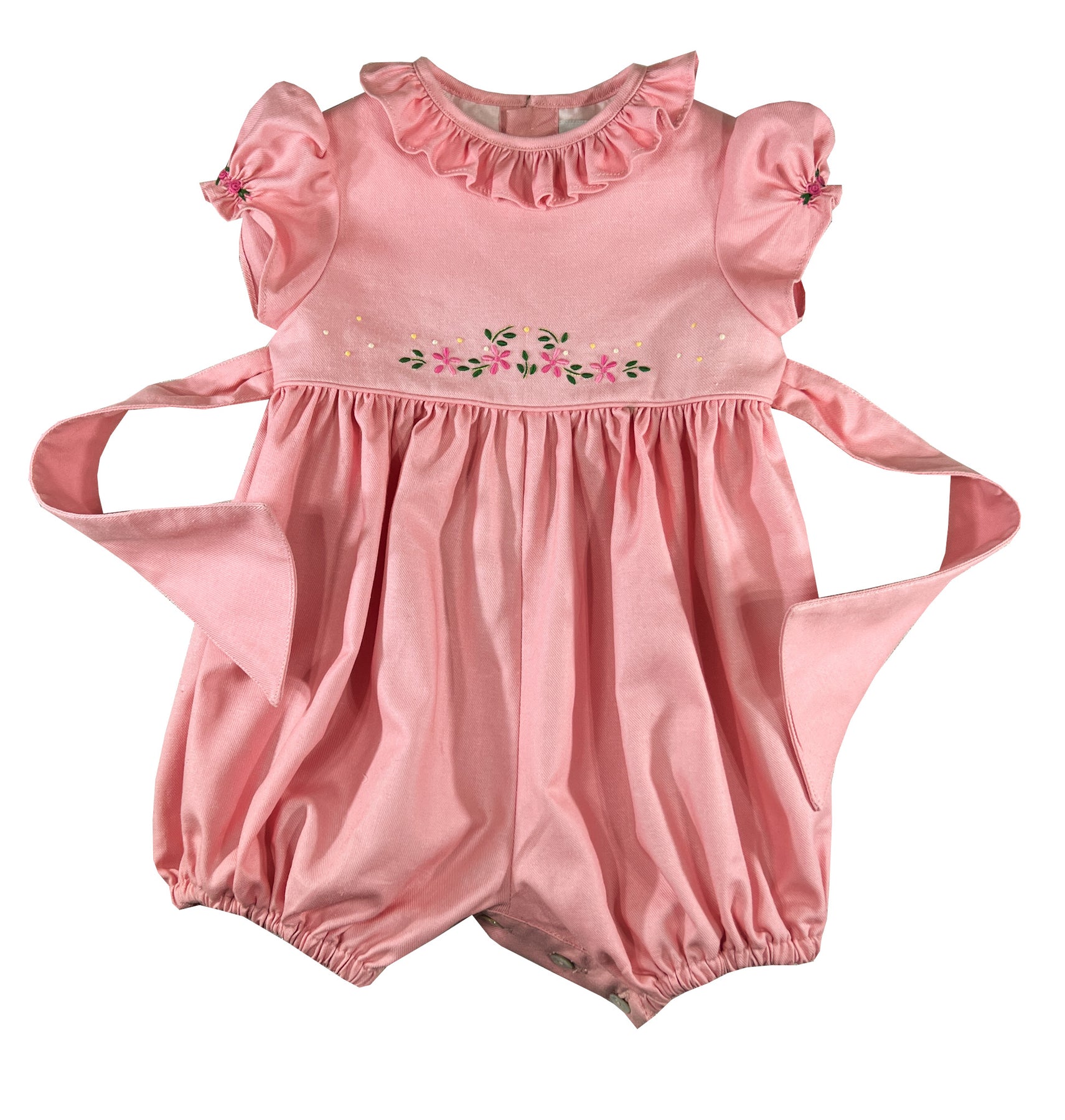 A wide ruffled neckline frames the face, while the shoulders feature the most adorable gathered sleeve caps, each one finished with a delicate embroidered daisy and tiny button detail. The bubble silhouette is gathered at the legs, creating that classic romper shape that's both practical and utterly charming. The garment fastens at the back with mother-of-pearl buttons and between the legs It features a generous sash that ties in a bow allowing for adjustable fit.